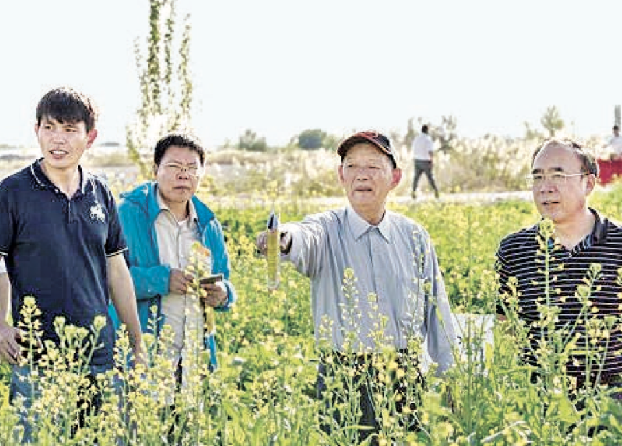 傅廷栋院士(右二)等查看盐碱地饲料油菜长势。