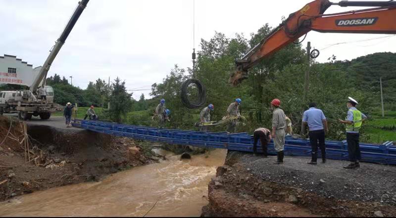 8月12日,国网荆门供电公司电力抢修人员通过临时钢构便道赶往抢修现场。余梦诗 供图