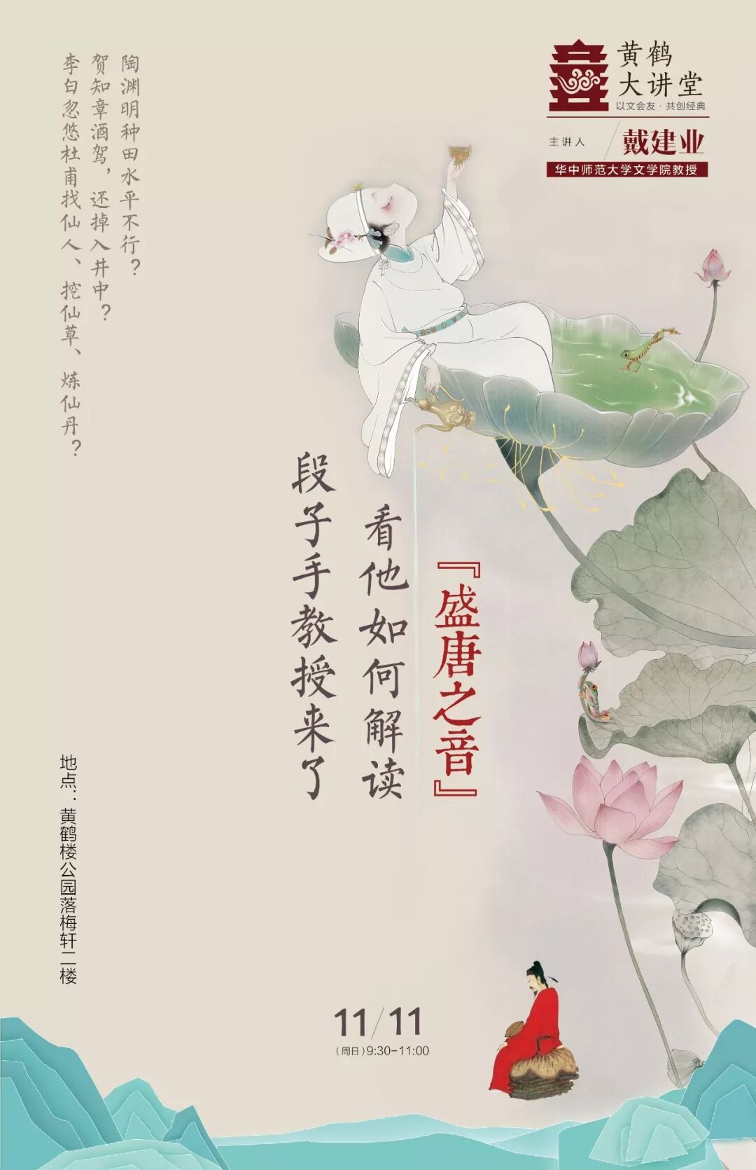本周日早上9点30分,由黄鹤楼公园主办的“黄鹤大讲堂”推出“段子手教授来了,看他如何解读盛唐之音”讲座活动。