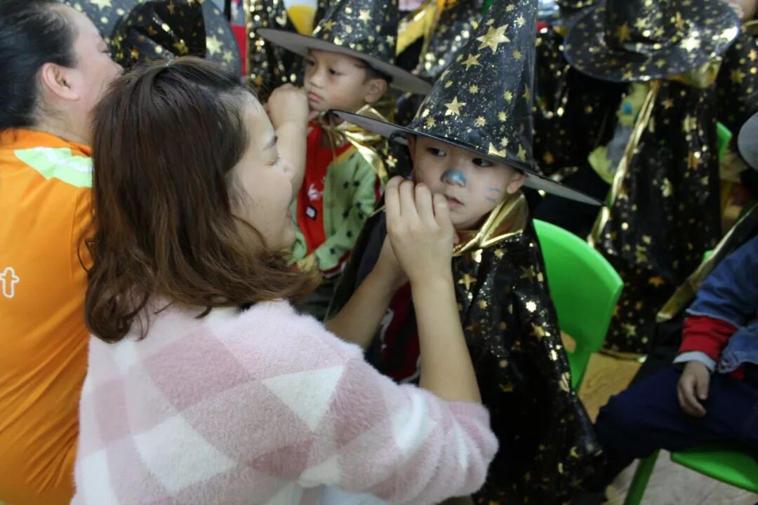 然后自己动手制作万圣节面具,小朋友们在老师的带领下带着自己做的面具换上万圣节服装,领取小南瓜灯,体验一场“不给糖就捣蛋”的奇妙之旅。