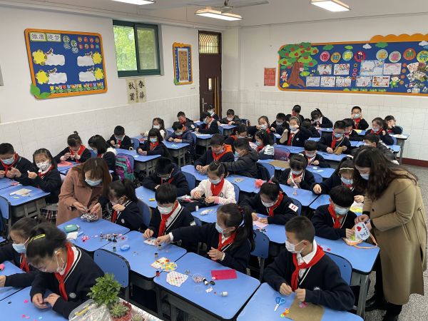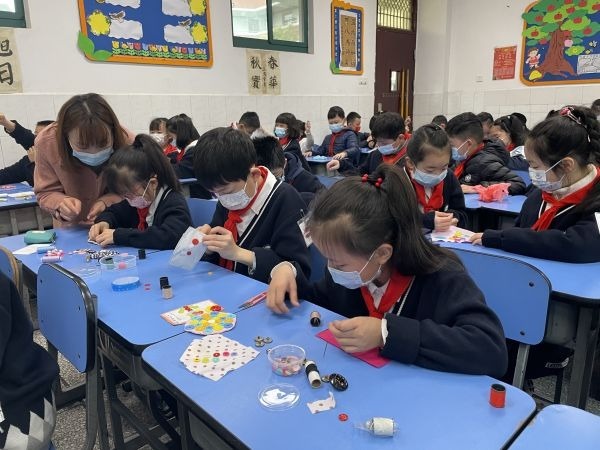 长江日报大武汉客户端4月7日讯 “纽扣作为一种文化象征而存在。从外形上看,其外圈是圆的,象征着辽阔天地;内圈也是圆的,象征内心平宁安远。”4月7日,武汉市育才家园小学课后服务时间段,一位“老师”正在给三(4)班学生进行劳动技能讲解。据悉,“老师”其实是一位家长志愿者。“双减”政策实施以来,该校有一批这样的志愿者“老师”走进校园,丰富了孩子们的课余生活。
