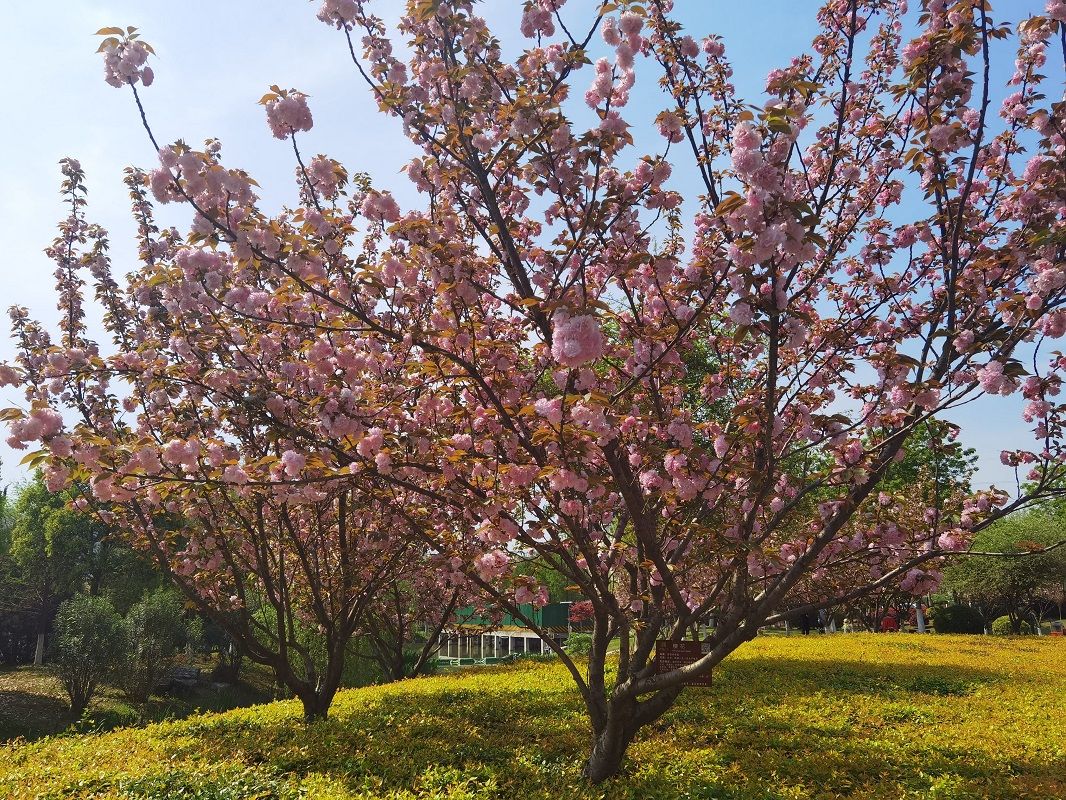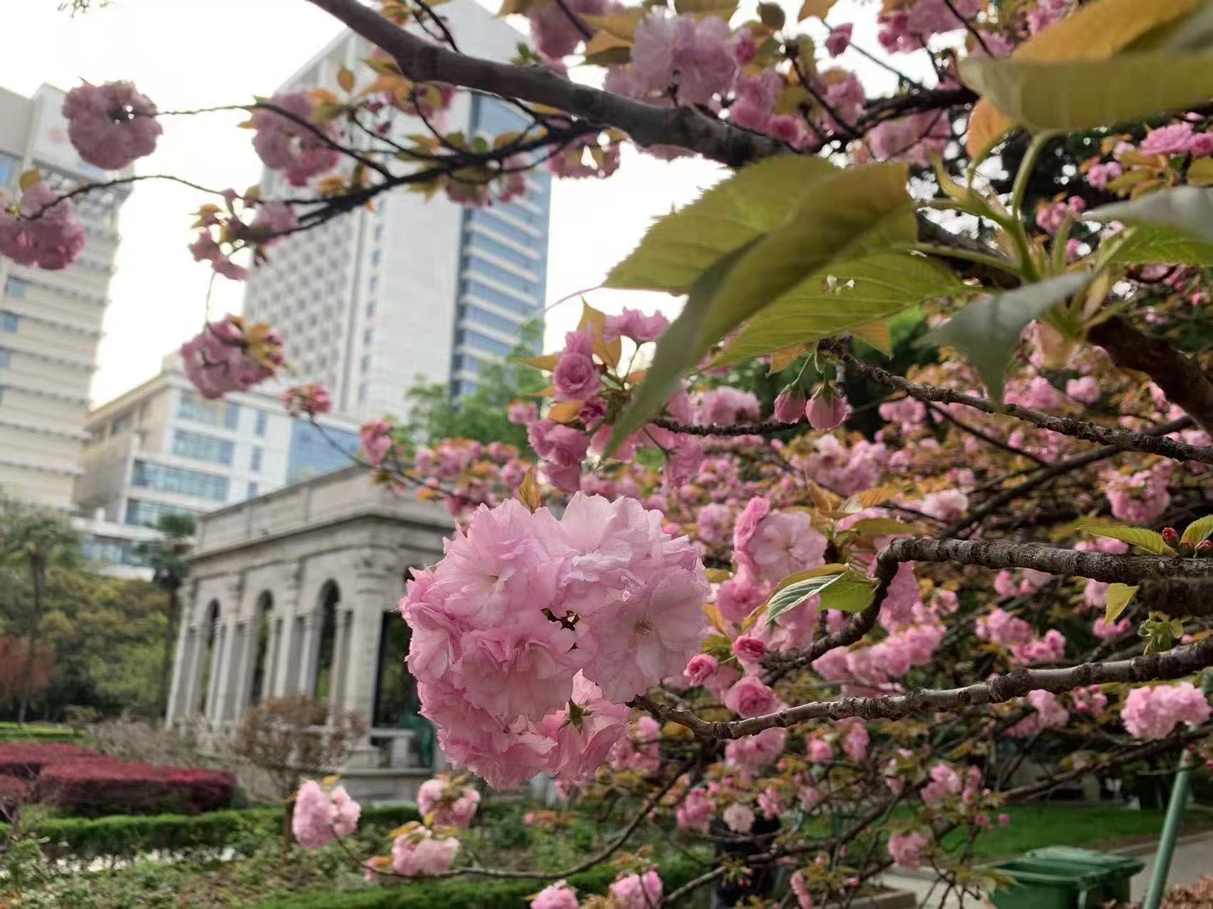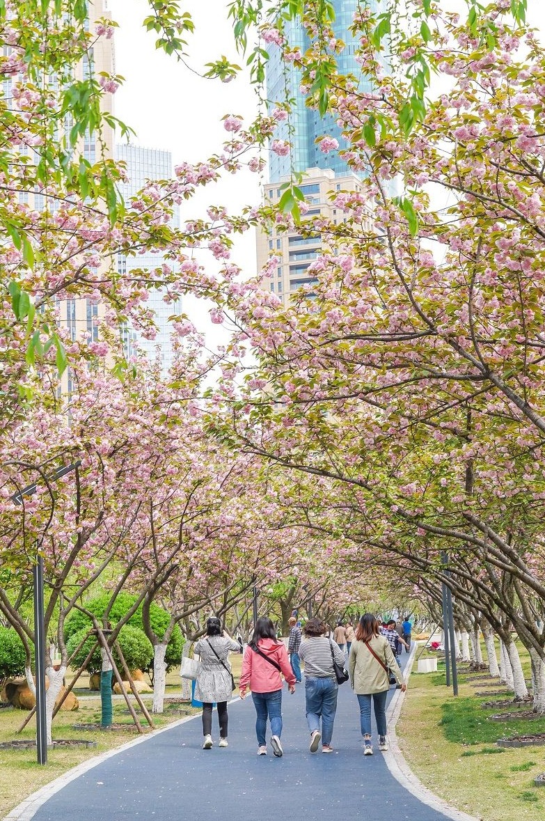 这些地方可搭赏樱“末班车”5日,东湖樱园正式闭园,但武汉的樱花季还未结束。不少公园里,成片晚樱还在热烈绽放。西北湖广场的樱花大道上,种有114株晚樱,主要是粉色的关山樱、淡红带白的普贤象樱,还有两株绿色的郁金樱。花团锦簇的枝条从两侧向中间交叉,仿佛一个樱花廊架,游人行走其中,浪漫至极。