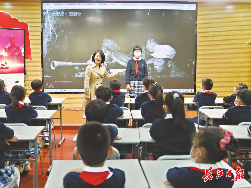 “那是1953年7月16日,我太爷爷所在的51号高地遭到敌军进攻,连续轰炸了3个多小时。敌军约有1个连的兵力,志愿军仅有两个班,所幸阵地上武器弹药充足,战士们架起机枪,拿出手榴弹、炮弹,勇猛还击……”4月6日上午,江岸区惠济路小学六(1)班学生胡钰彤与思政教师陈哲玲走上讲台,和来自不同年级的小伙伴们同上一堂思政课。课堂上,她代表91岁的太爷爷杨勇锋讲述了一段令人心潮澎湃的战斗经历,追思最可爱的人。