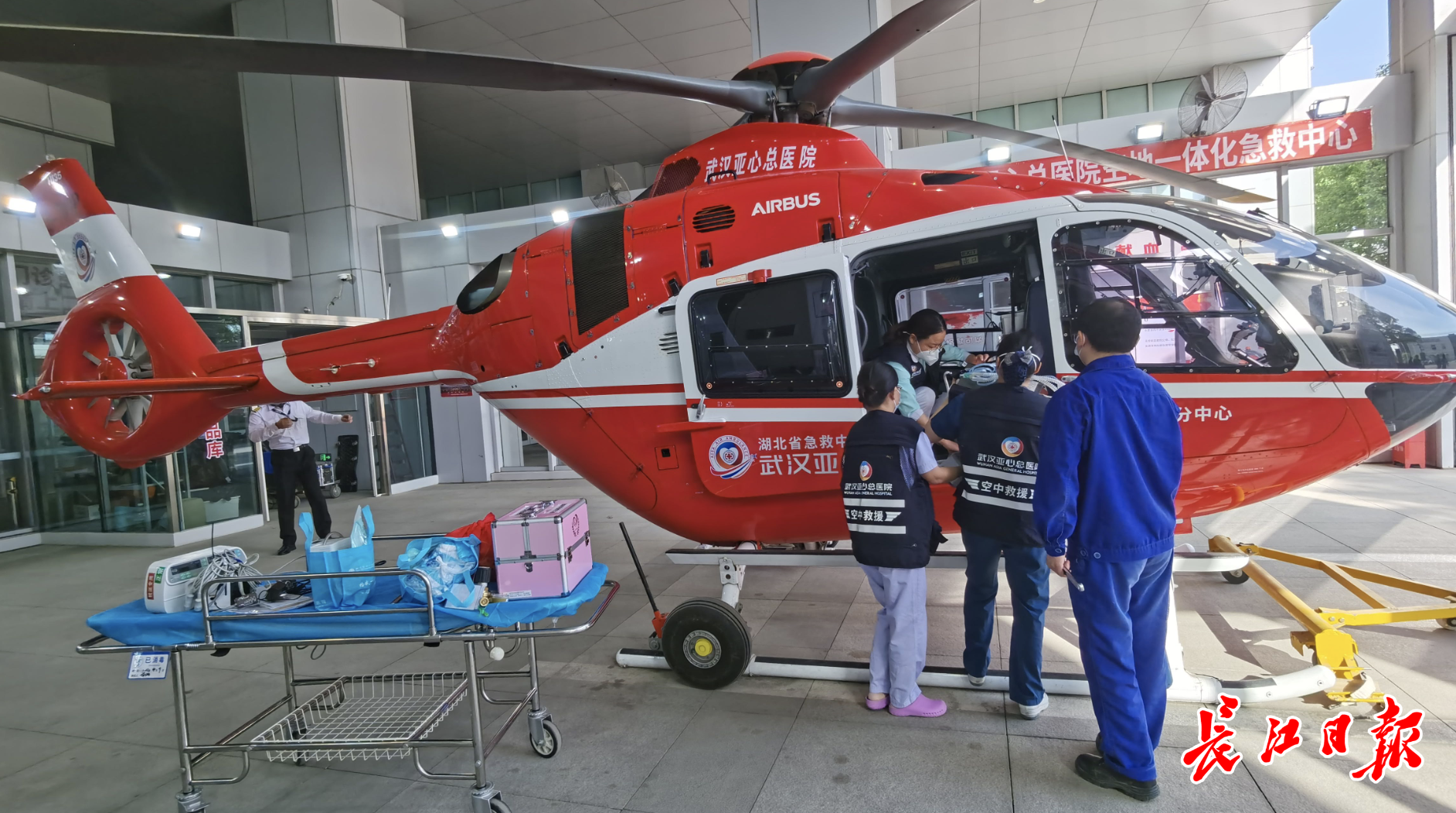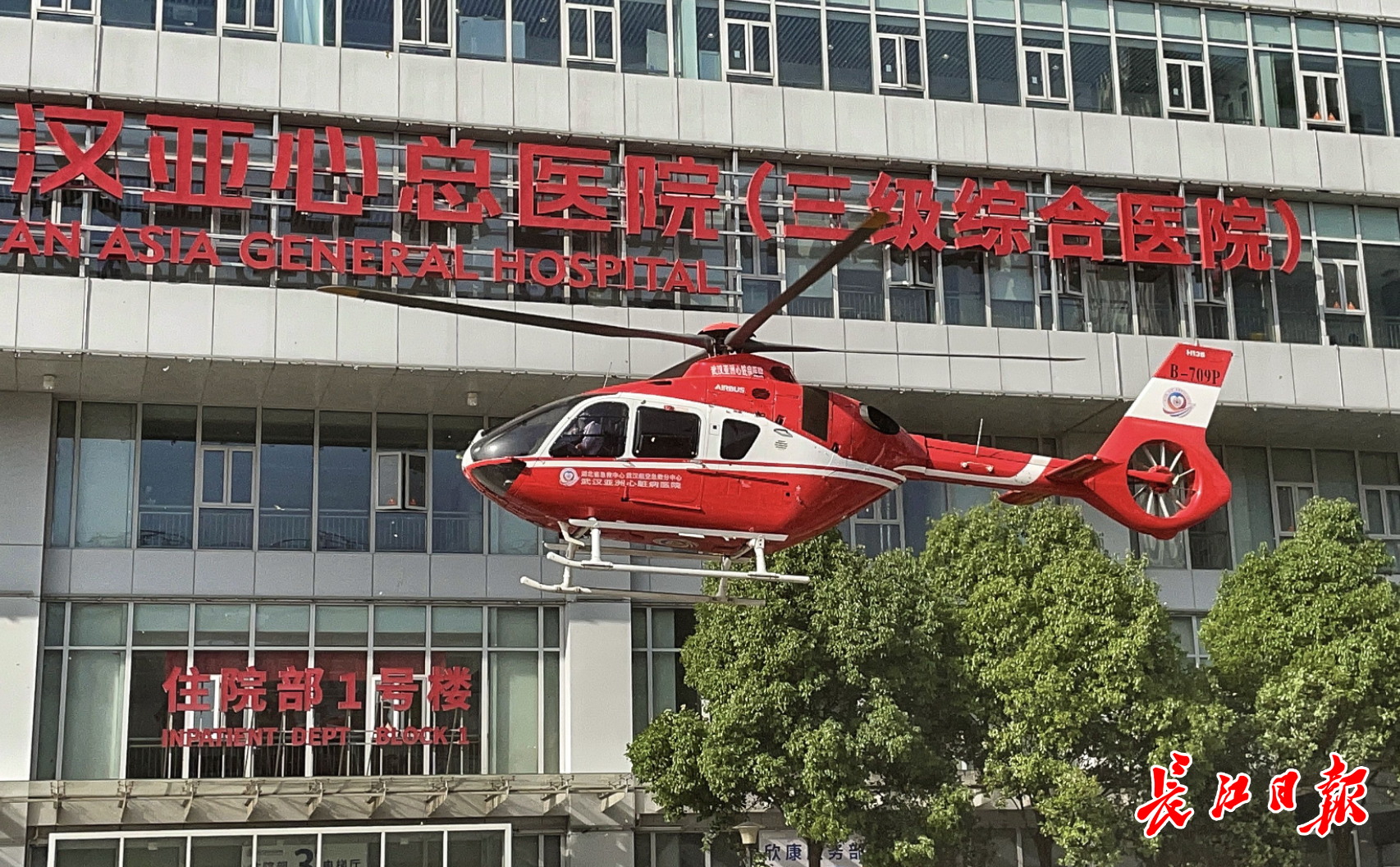 8时10分左右,记者在武汉亚心总医院门口看到,一架红白相间的医疗救援直升机飞机滑出到医院大楼前的空地上,准备起飞。在螺旋桨的轰鸣声中,直升机升起。据介绍,直升机在楼顶停机坪上短暂停留,搭载医护人员后飞往十堰。