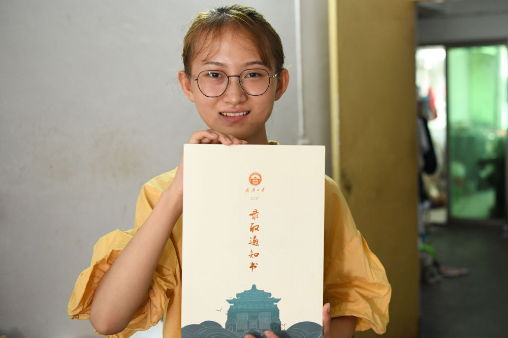8月28日,欧阳程程在安庆市租住的房子里展示武汉大学录取通知书。新华社记者 张端 摄