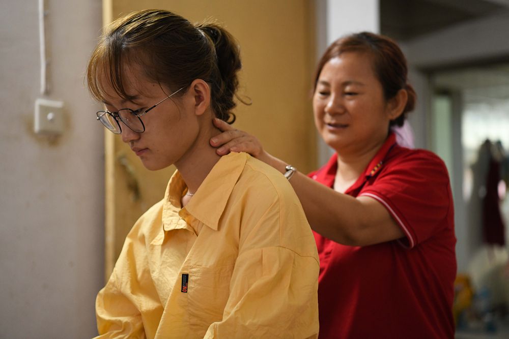 8月28日,妈妈方慧霞在安庆市租住的房子里给欧阳程程(左)按摩。新华社记者 张端 摄