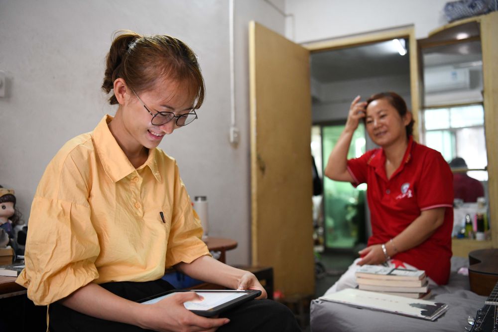 8月28日,欧阳程程(左)和妈妈方慧霞在安庆市租住的房子里。新华社记者 张端 摄