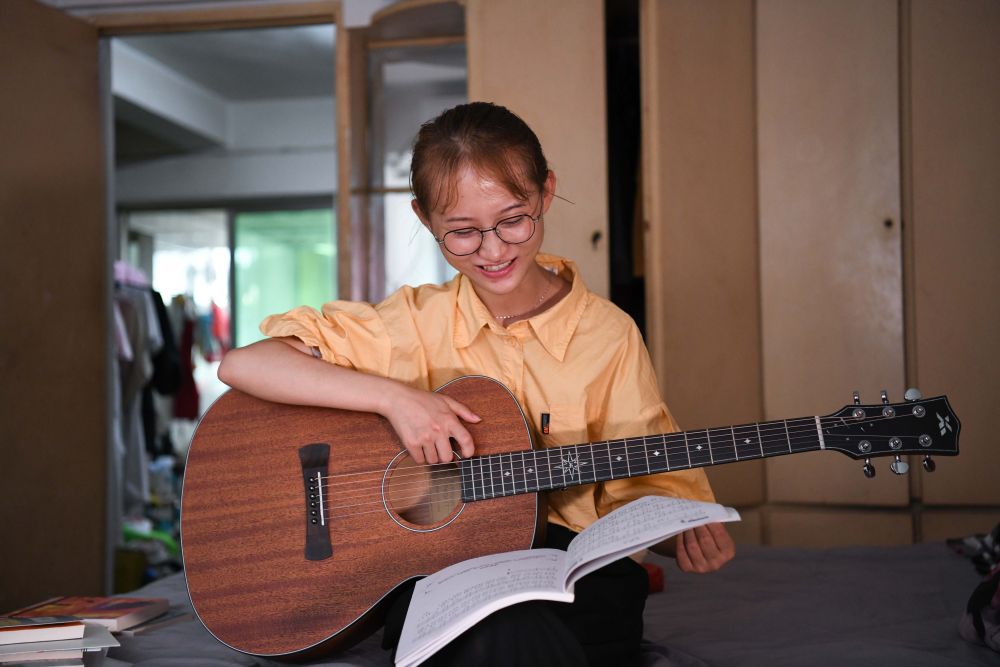 8月28日,欧阳程程在安庆市租住的房子里练习吉他。新华社记者 张端 摄