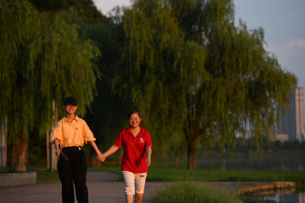 8月28日,欧阳程程(左)和妈妈方慧霞在安庆市菱湖公园内散步。新华社记者 张端 摄