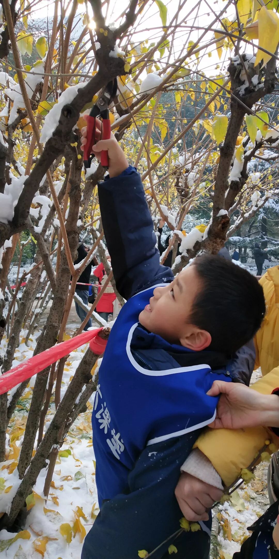 最后的体验环节,孩子们一一上前、兴趣浓厚地拿起枝剪,在陈老师的指点下,剪掉长势不佳的枝条。经过一番修剪,来年的蜡梅树形会更加美观饱满。