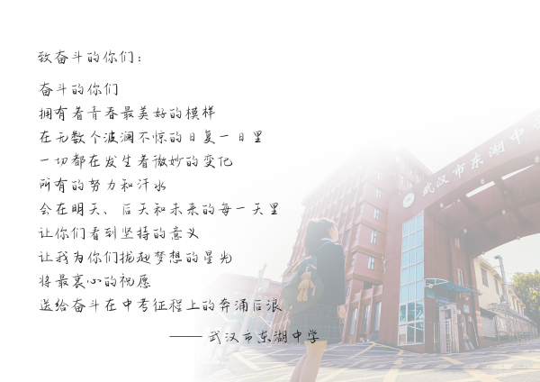 长江日报大武汉客户端4月26日讯 “让我为你们拢起梦想的星光,将最衷心的祝愿,送给奋斗在中考征程上的奔涌后浪!”本周,武昌区不少初三的学生收到了一沓特别的“加油明信片”,明信片用唯美的校园生活图景和如诗般的文字,为即将步入中考考场的初三学生们“讲述”了令人向往的高中故事。长江日报记者了解到,这套特别的明信片由武汉市东湖中学的老师们策划、设计。“我们想通过这种不一样的方式,给孩子们以期许和鼓励。”该校校长王朝文说。
