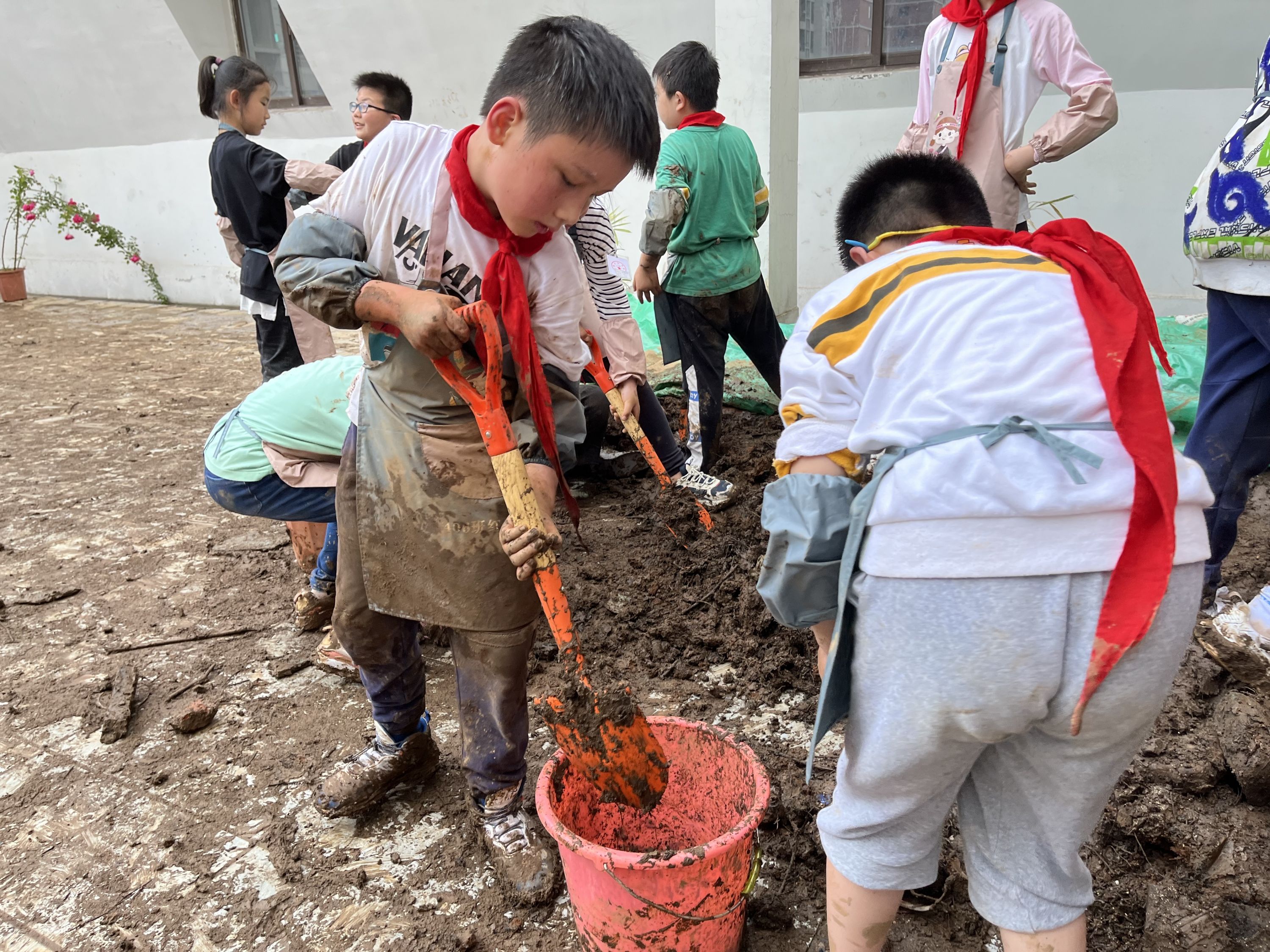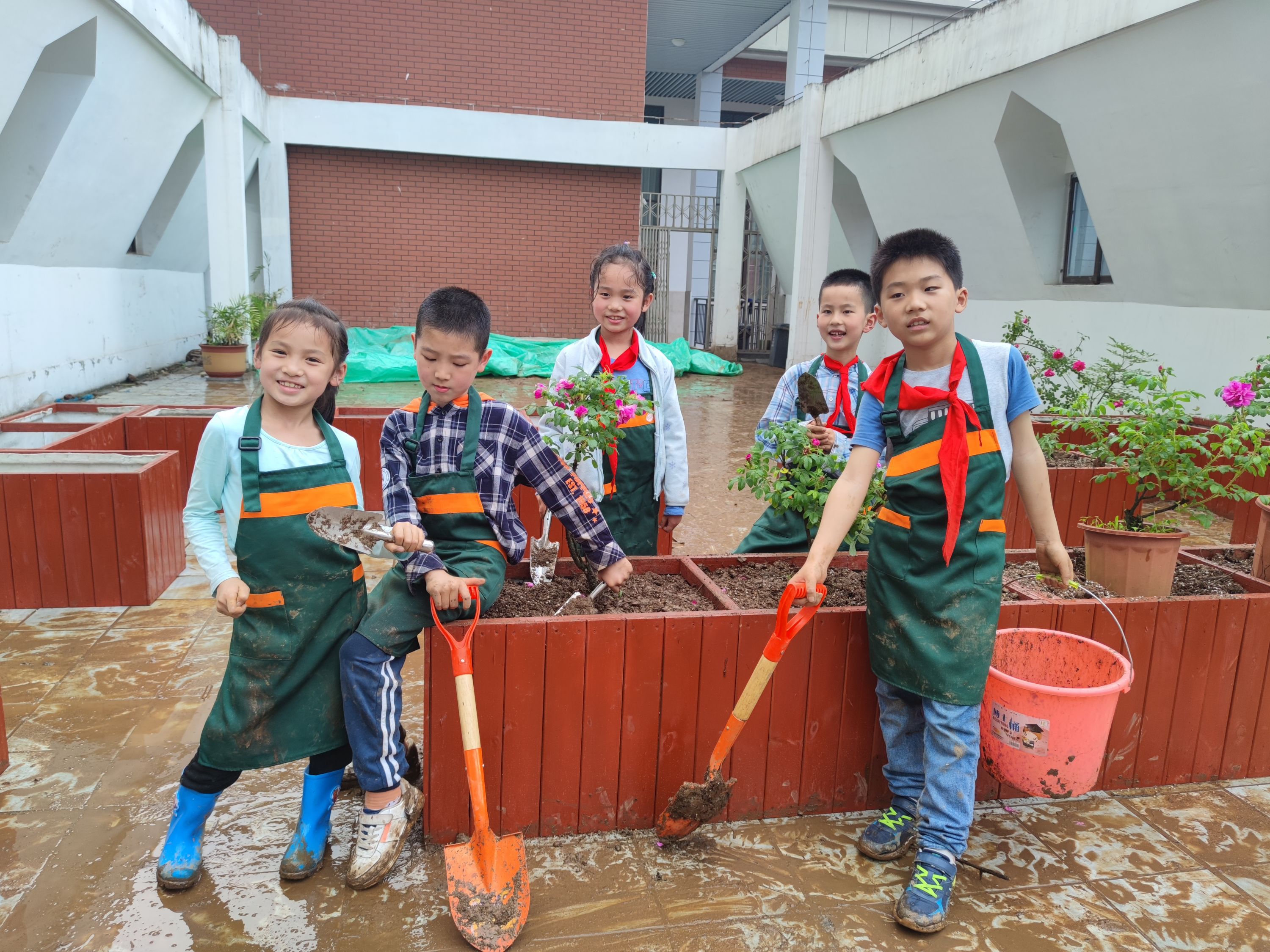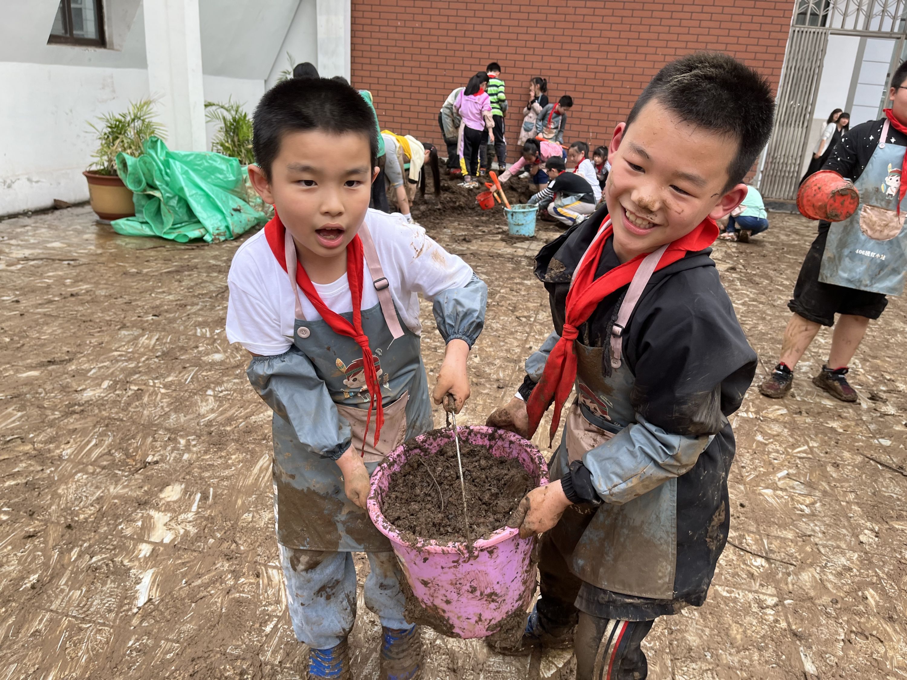 孩子们迫不及待地拿起小铲子、铁锹、簸箕等劳动工具,分工合作,运土、填土并播种。经过5个多小时的劳动,孩子们都成了“小泥人”。203班学生彭晨轩说:“虽然衣服、裤子和鞋都脏了,手上也全是黑黑的泥土,但植物能够‘呼吸’了,我感到很快乐!”