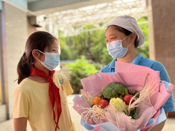 长江日报大武汉客户端4月29日讯 4月29日上午,江岸区新村小学食堂师傅戴敏收到一束特殊的“花束”——“蔬菜花束”,其中有小白菜、番茄、金针菇等等,“第一次收到这么特别的礼物,一看就特别有营养,我想这就是幸福的味道!”戴敏说。