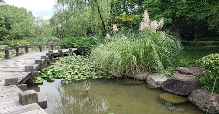 小草坪常寓于大草坪中或配植成单独的草坪空间,如植物园山水园旁封闭小草坪、花港公园内蒋庄庭园小草坪都给人以安逸宁静、小巧舒适的享受。这些草坪的组织都是通过植物及地形进行空间的分隔。草坪周围配植乔灌木,以其树冠从立面上划分了植物空间。