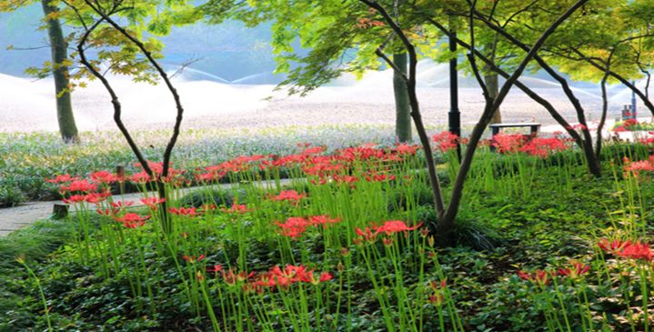 地被植物被广泛应用是杭州园林植物造景重要组成部分之一。在一些公园、风景点的空旷地、山坡、林下、岸边和路旁,广泛栽种地被植物,大大丰富了园林的色彩和景观,兼收绿化和美化的效果。