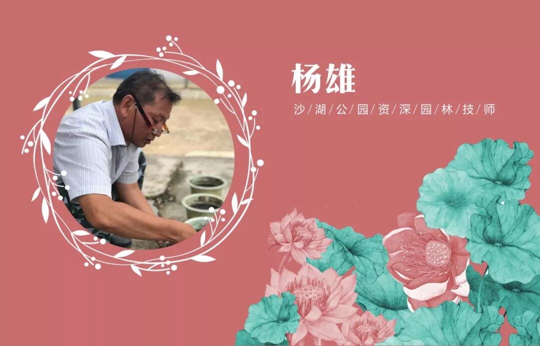 他是沙湖公园的杨雄,荷花专家培育荷花数万盆,建立了中国荷花品种基地,引种、育种荷花品种800个,睡莲、水生植物30余种,在沙湖沿岸栽种荷花500亩,水生植物12000株。