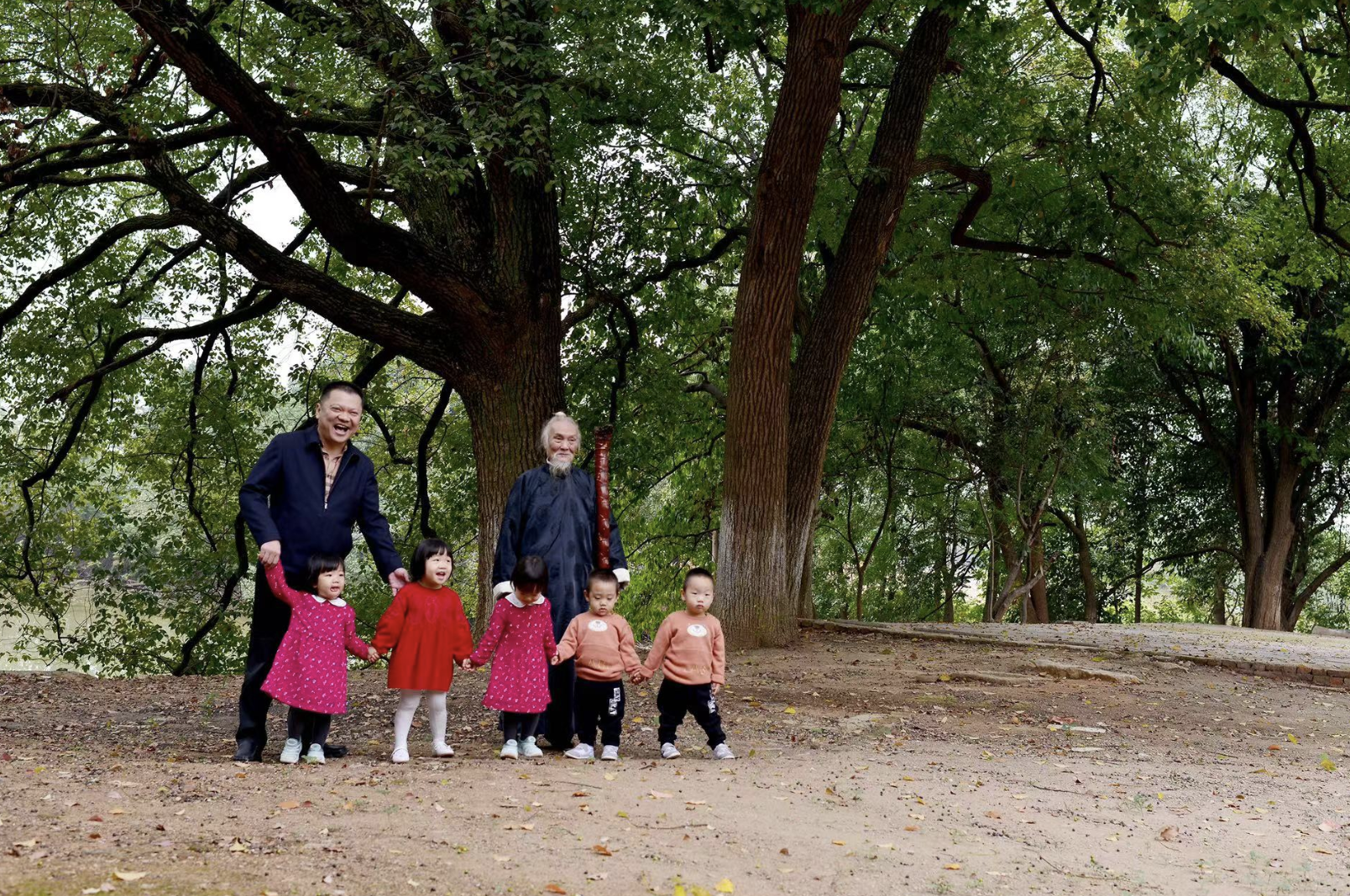 曾昭生带着儿子曾宪军和几个曾孙回到老宅看望古树,全家四代人站在那棵百年香樟树下拍下一张全家福