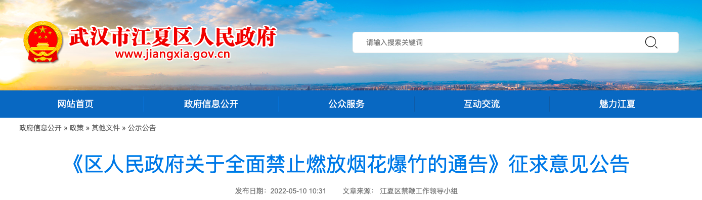 5月10日,武汉市江夏区禁鞭工作领导小组发布公告,对《区人民政府关于全面禁止燃放烟花爆竹的通告(征求意见稿)》(以下简称《通告》)征求意见。