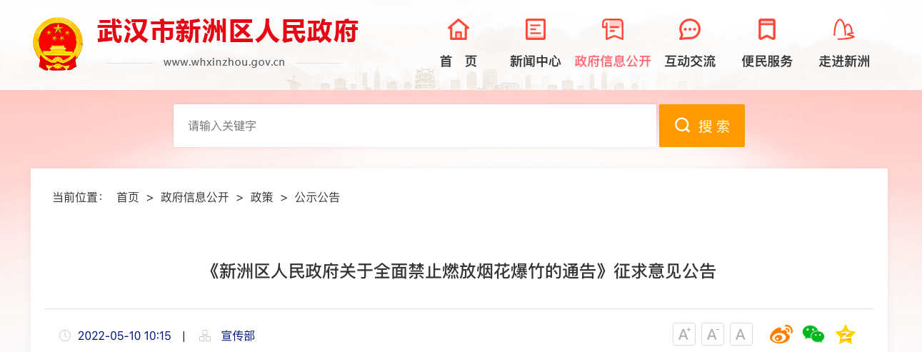 《新洲区人民政府关于全面禁止燃放烟花爆竹的通告》征求意见公告