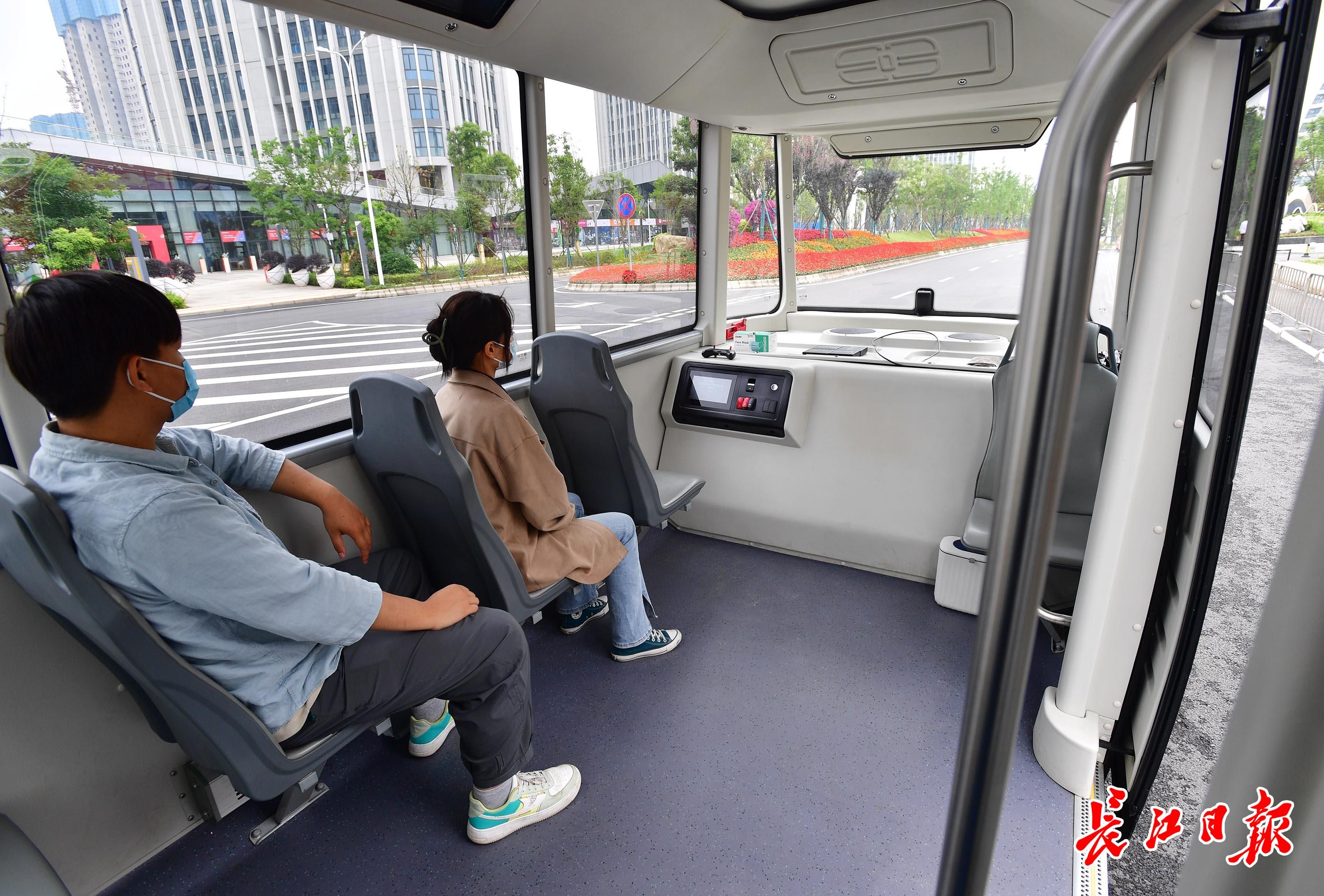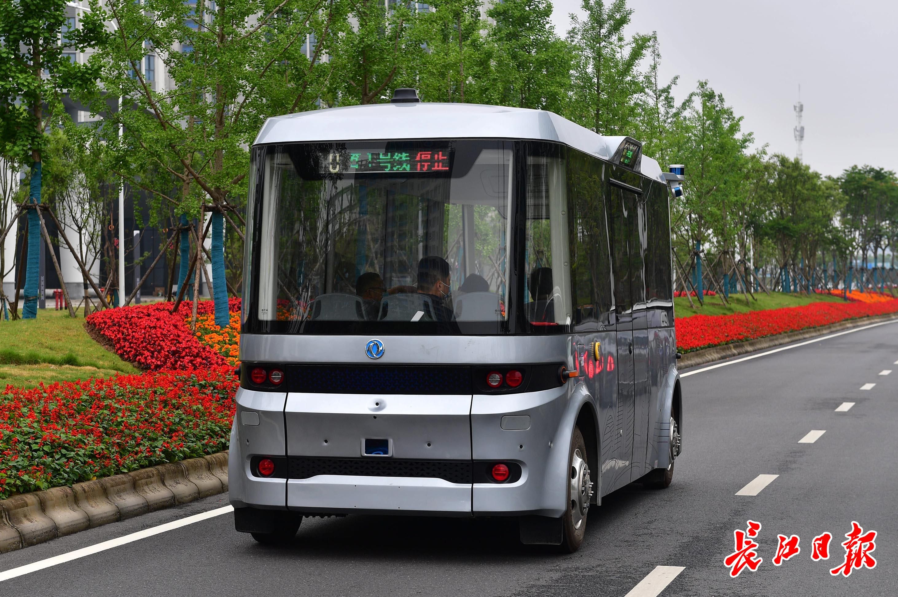 5月10日,武汉经开区川江池二路生态城春笋站,银白色的“春笋号”升级版Sharing-BUS加入了无人驾驶接驳巴士的车队,为市民提供服务。记者李永刚摄