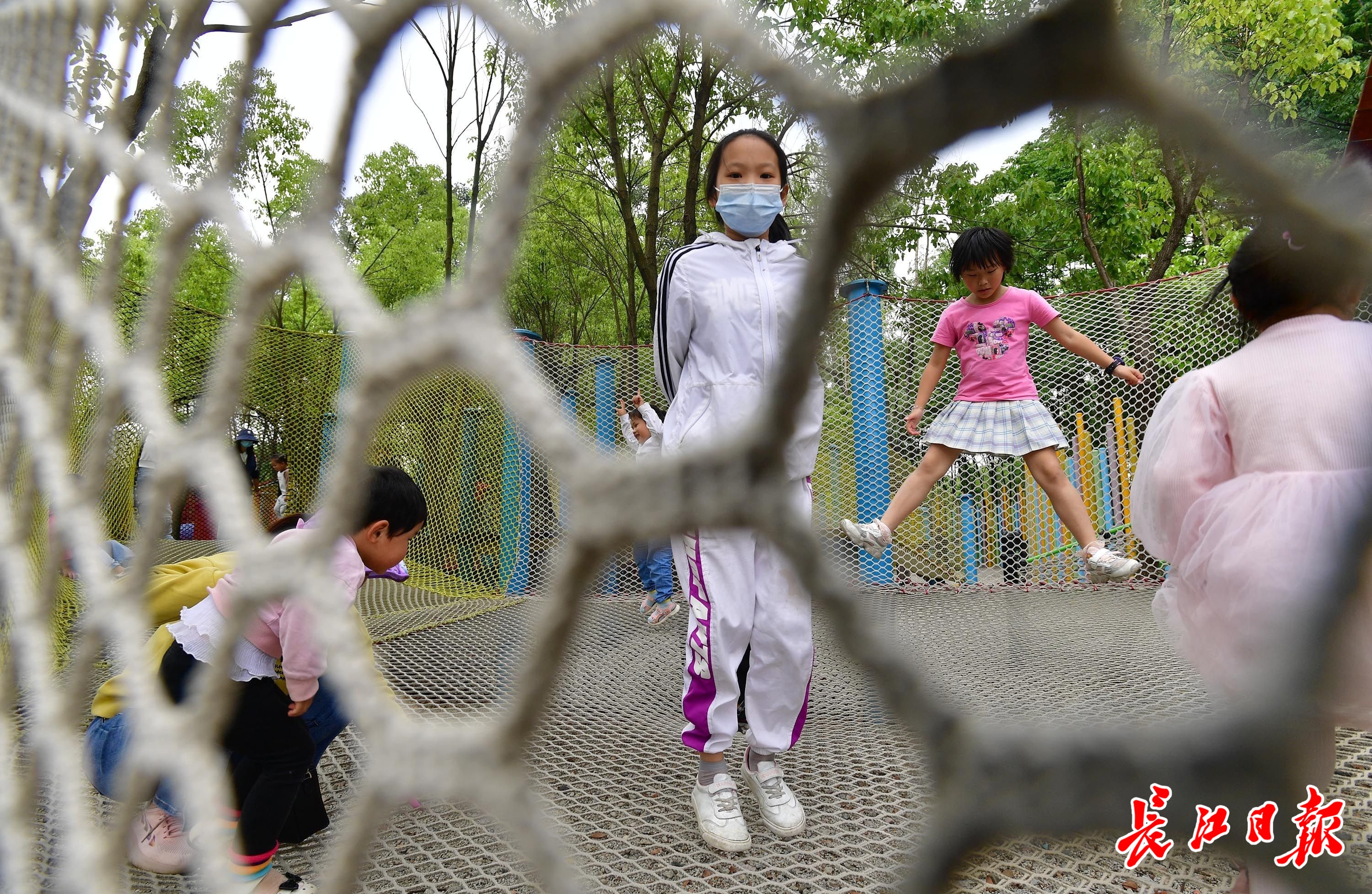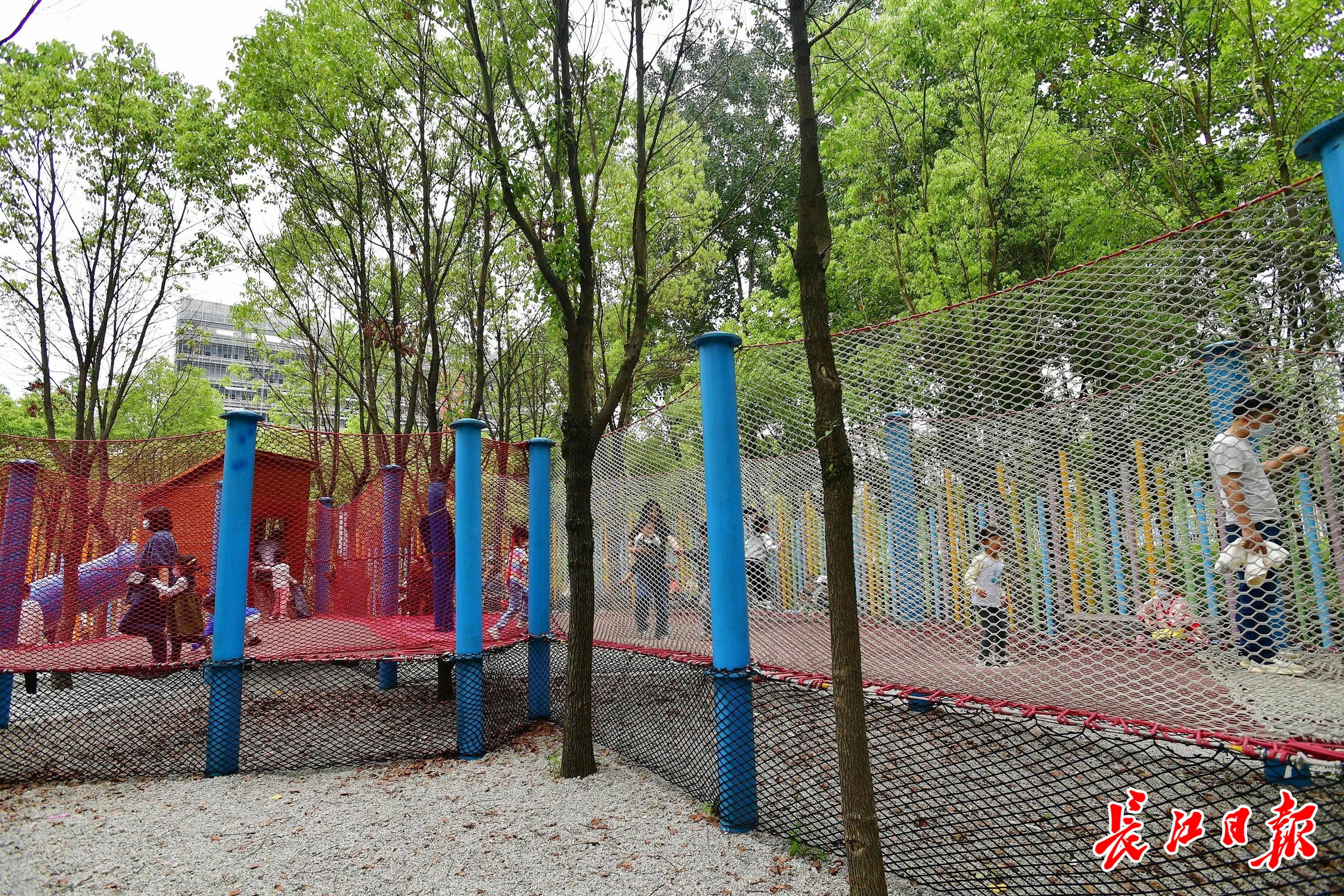 在东西湖金银潭公园内,树林中的“丛林密网”蹦床成了孩子们的乐园。走上“密网”,脚下强劲的弹力让每一个人都成为轻功高手,轻松“起飞”,随意跨越。孩子们在“密网”间时而飞奔,时而高高跃起,玩得不亦乐乎。