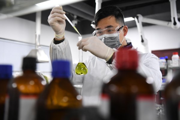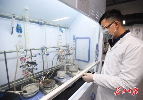 走入“马蹄莲”,在武汉华科中英纳米科技有限公司,华中科技大学博士后王学朋正在把刚处理好的黄色粉末装进样品瓶里,制作一种有机多孔聚合物材料。