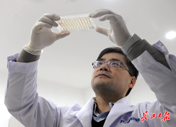 优睿赛思(武汉)生物科技公司总经理吴海博士在B细胞培养实验室进行B细胞原代培养。 记者高勇 摄