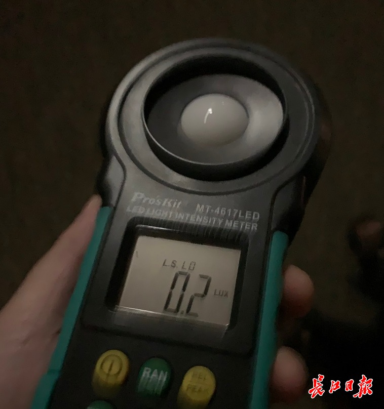 在码头潭公园北部的主干道内,记者使用自购的照度计进行检测,发现距离灯具1.5米的下方,测得照度为1.7勒克斯,而在两盏灯之间的大部分路面,测得的照度为0.2勒克斯,为了看清检测仪上的数字,记者几乎贴在屏幕上才能看清。