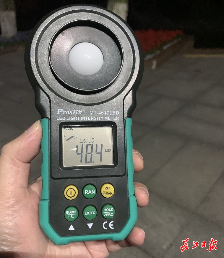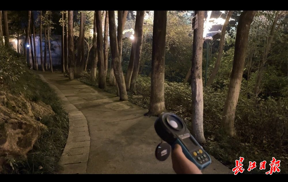 在几个公园的仪器检测中,记者发现人行道照度只要在4—10勒克斯左右,基本可满足人眼夜间自觉舒适的亮度需求。如果以此作为参照的话,码头潭公园内的大部分活动区域,亮度差别在5倍以上。