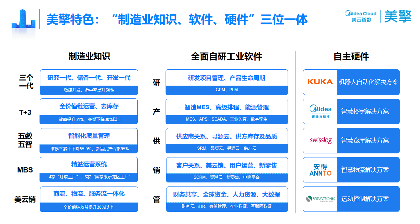 来源于制造,从而更懂制造。作为美的成立的专门服务制造业转型的数字化公司,美云智数在美的“灯塔工厂”的建设中起到关键作用:自研工业软件加上数字转型实践,集成4座“灯塔工厂”的智造经验。日前,国家工信部遴选14家“2022年新增跨行业跨领域工业互联网平台”,美云智数的美擎工业互联网平台名列其中。集“制造业知识、软件、硬件”三位一体,是美擎最大的特色,也是它在众多平台中脱颖而出、荣获国家级认证的重要原因。