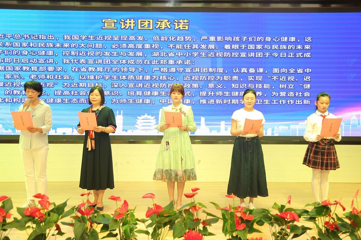 宣讲团第一次集体备课,发布学生、家长、老师、校长、专门机构管理学生视力健康课。湖北省教育厅、武汉市教育局领导为湖北省中小学生近视防控宣讲团颁发聘书并授旗。