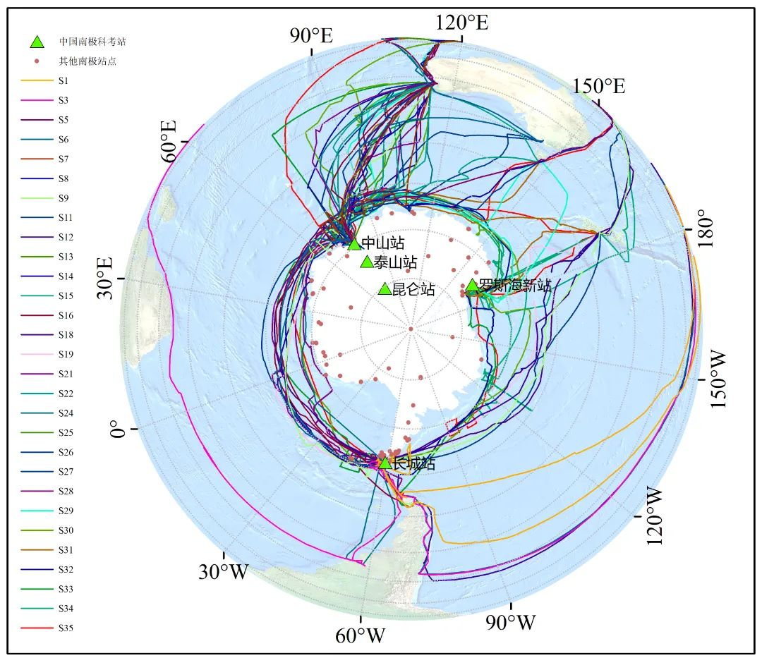 1984年至2019年中国历次南极考察航线(艾松涛等,2021)。校方供图
