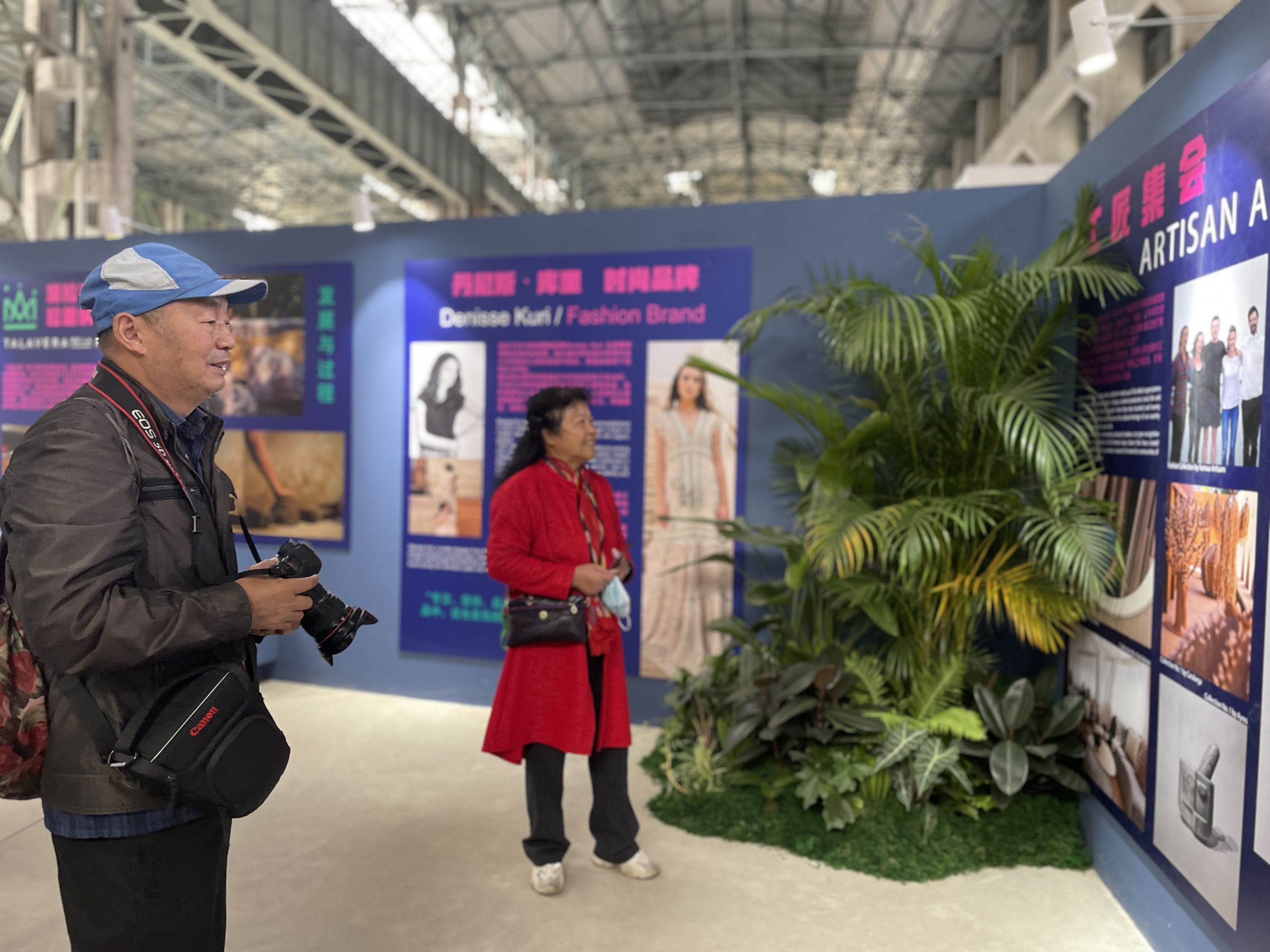 李茂松仔细看展板,不远处的祝元香对展区的绿植很感兴趣。
