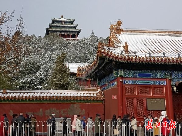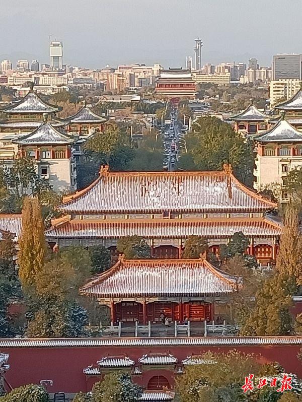 长江日报记者跟随人流来到故宫后门的景山公园,排了几公里长队登上万春亭,俯瞰北京中轴线上的建筑群,故宫、北京奥林匹克塔等银装素裹,壮美如画。