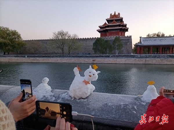 故宫护城河岸的小雪人格外抢镜。长江日报驻京记者柯立 摄