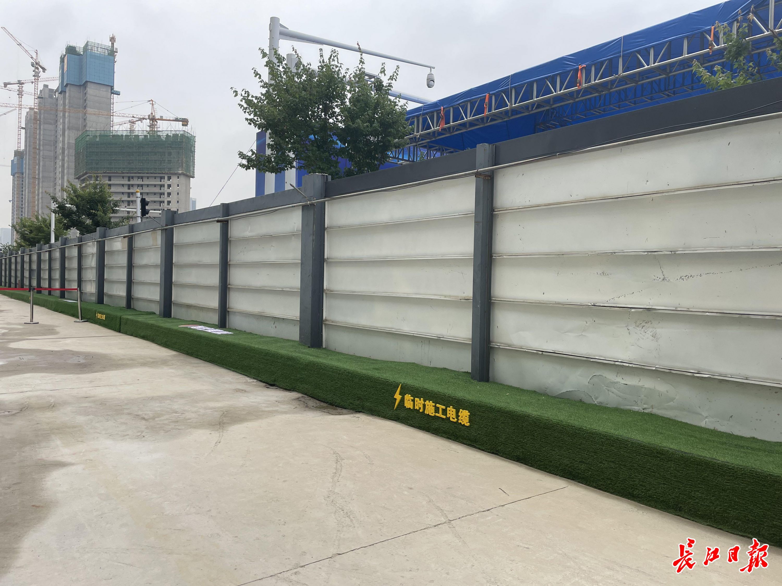工地的临时施工电缆沿围墙地面封闭敷设,还用绿植覆盖好,干净规整。记者王慧纯 摄