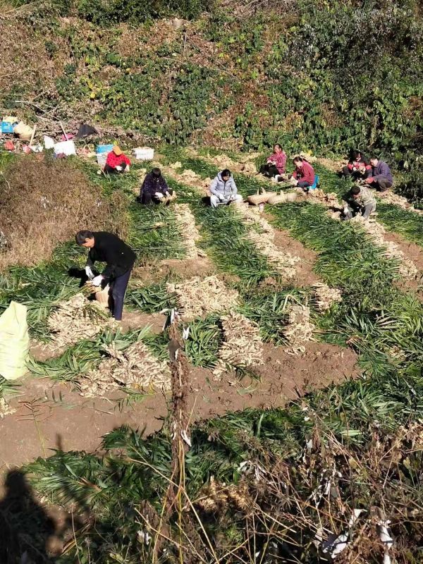土门河村地处鄂皖交界的大别山区。几年前,安徽姜农开始到土门河村租地种小黄姜,利润很不错。2019年,土门河村决定和安徽姜农合作开发小黄姜产业,安徽姜农出种子和技术,土门河村出土地和劳动力。2020年,土门河村的小黄姜种植规模扩大到了200多亩,当年平均亩产5000斤,批发商开着车到田里收购,4.2元/斤,小黄姜很快就销完了。