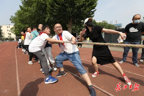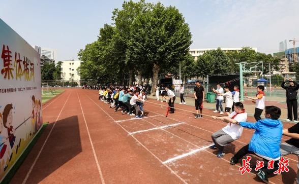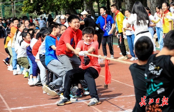 “一二,拉……”拔河赛场激情四射。场上,小队员们个个斗志昂扬,咬紧牙关,毫不退让,奋力拼搏。