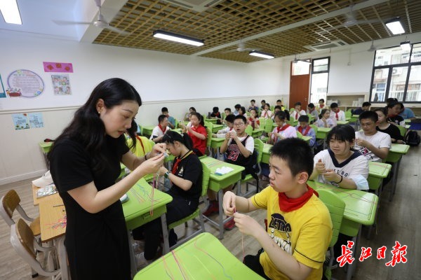 教室里,老师和孩子们齐动手,学习用彩绳编织蛋网,用无纺布做粽子挂件,用心用行动体验我国传统节日中蕴涵的意义。