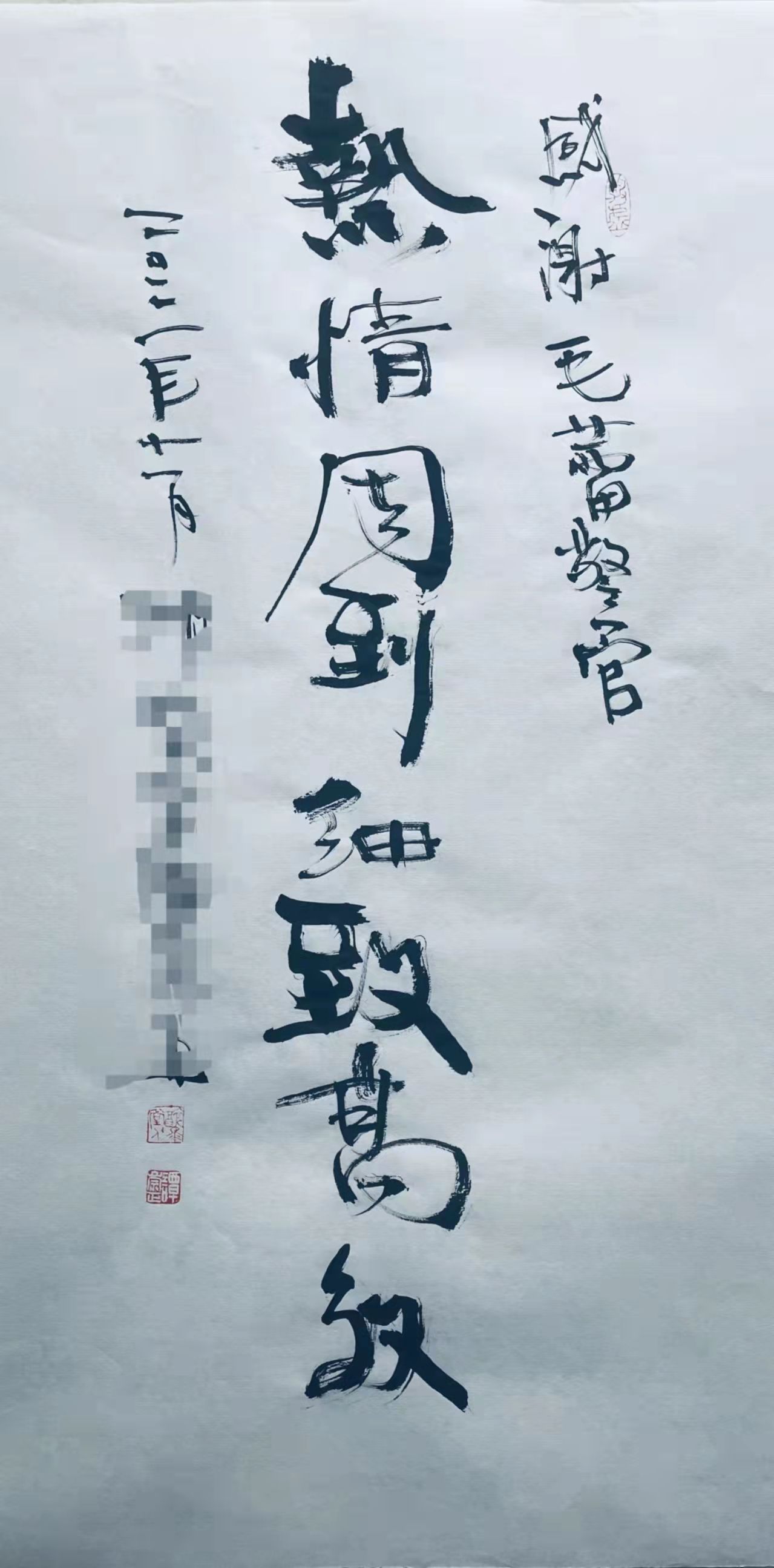 长江日报大武汉客户端11月13日讯(记者戴旻阳 通讯员孙逊)11月10日,大学老师谭先生来到武昌区政务服务中心公安窗口,办理落户业务的同时,还带来了一份特殊的“礼物”——一幅由他书写的“热情周到 细致高效”字样的书法作品。在艺术学院任职的他以手书锦旗的方式,感谢窗口民警帮其量身定制解决方案。