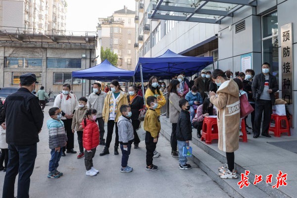 11月13日,唐家墩街社区卫生服务中心新冠疫苗接种点,顶绣晶城幼儿园的小朋友们,在家长老师的陪护下,有序接种新冠疫苗。接种儿童需由学校统一组织,家长全程陪伴,医院专业保障。 记者胡冬冬 摄