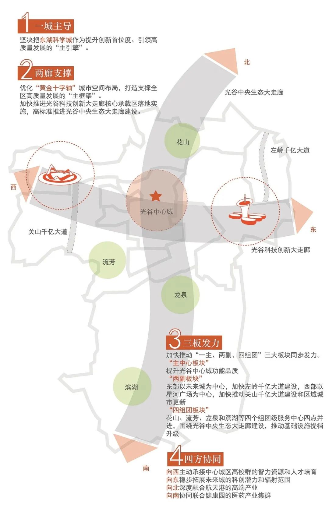 同时,回应湖北对武汉“一主引领”的期待,依托光谷为核心,城市发展划出一条新的路径——光谷科创大走廊。而大走廊核心承载区三大创新节点之一就是光谷中心城,承担了“科技研发、总部经济、科技金融、高端商务配套的融合区域”这一重任。