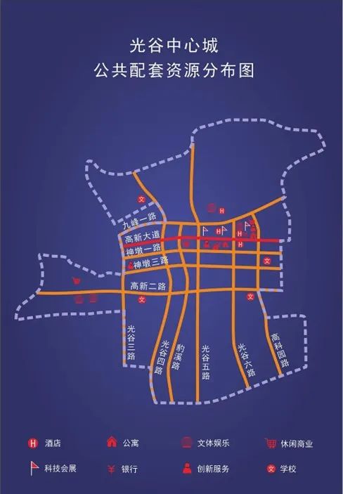 站在位于高新大道的光谷科技大厦向大道两侧望去,中国光谷科技会展中心、湖北省科技馆新馆、中粮大悦城等商业及公共配套设施全方位配齐,铁四院、江汉石油等同为行业龙头的企业总部集聚。