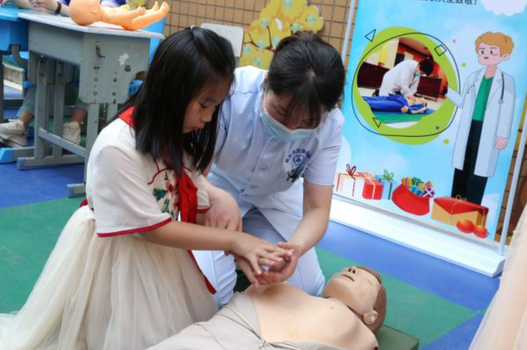 汉阳医院急救科护士现场教小楚娃学习心肺复苏术。通讯员刘丹 摄