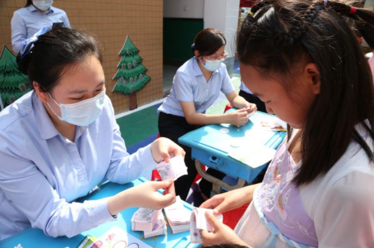 湖北银行职员教授小楚娃们体验“花式点钞术”。通讯员刘丹 摄