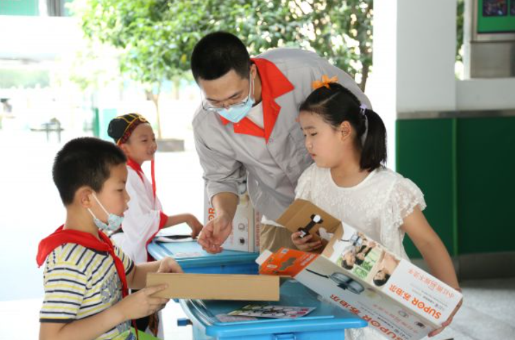 武汉苏泊尔炊具有限公司员工教小楚娃了解产品包装知识。通讯员刘丹 摄