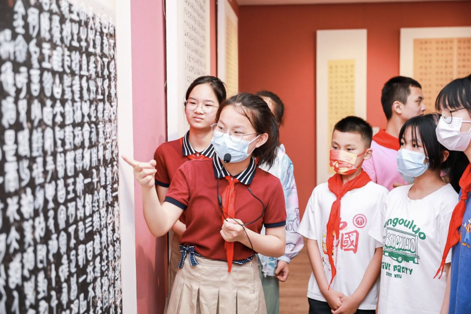 作品展中,武汉经开区书法教育联盟学校的师生用楷书、魏碑、隶书等字体向经典致敬,临摹出《张猛龙碑》《曹全碑》《大唐三藏圣教序》等书法作品。湖北省特级教师黄水中做现场导览,仔细地为毕业生们讲解每一幅作品。