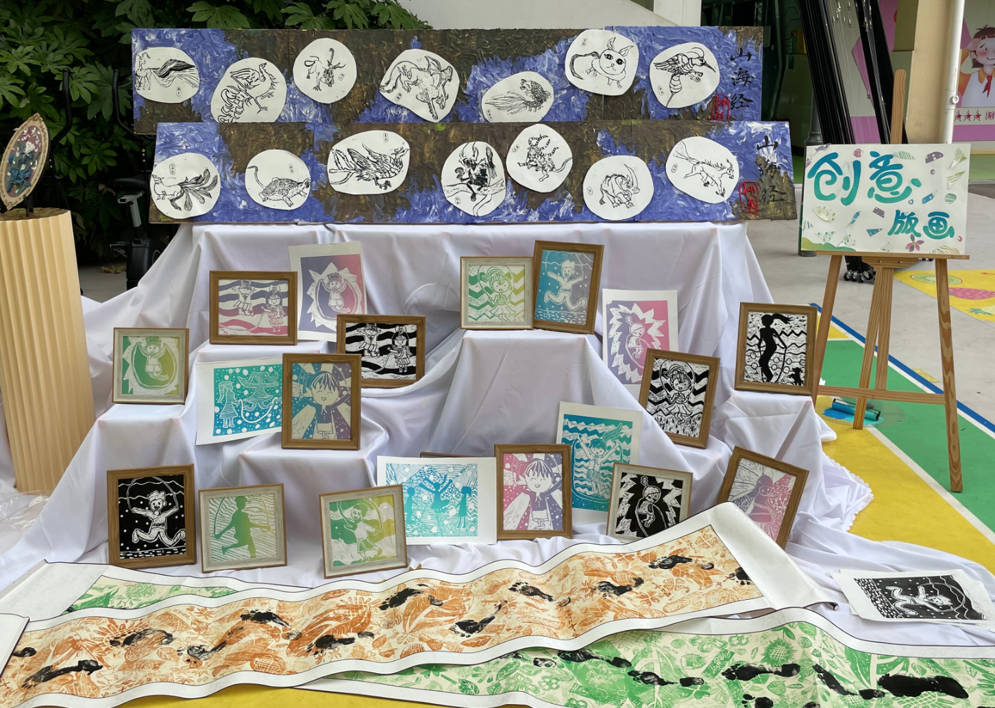 在指尖花艺坊,学生们用各种美术材料如彩纸、石膏、颜料进行创作,不一会牡丹、多肉等仿真植物就在孩子们的指尖“绽放”了。在版画社团的展示中,学生们雕刻《山海经——神兽》系列,并用版画机进行印制,作品别有一番韵味。