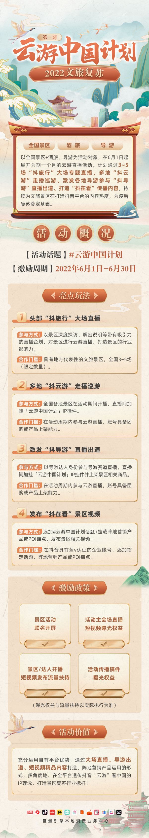 为进一步帮助文旅行业人气回暖,巨量引擎本地消费业务中心、抖音生活服务、抖音直播联合发起2022文旅复苏计划《云游中国》,整合平台资源优势,与活动官方合作伙伴元禾文旅一起,通过一系列活动提升目的地吸引力,对参与直播活动的导游和文旅景区给予专项流量扶持,在带动旅游业消费复苏的同时,以更加丰富的内容满足更多用户对美好旅途的向往。