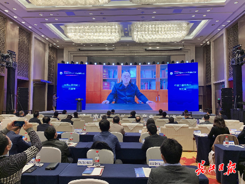 中国工程院院士、武汉市区块链产业研究院名誉院长刘经南以视频的方式致辞。 长江日报记者乔驰 摄